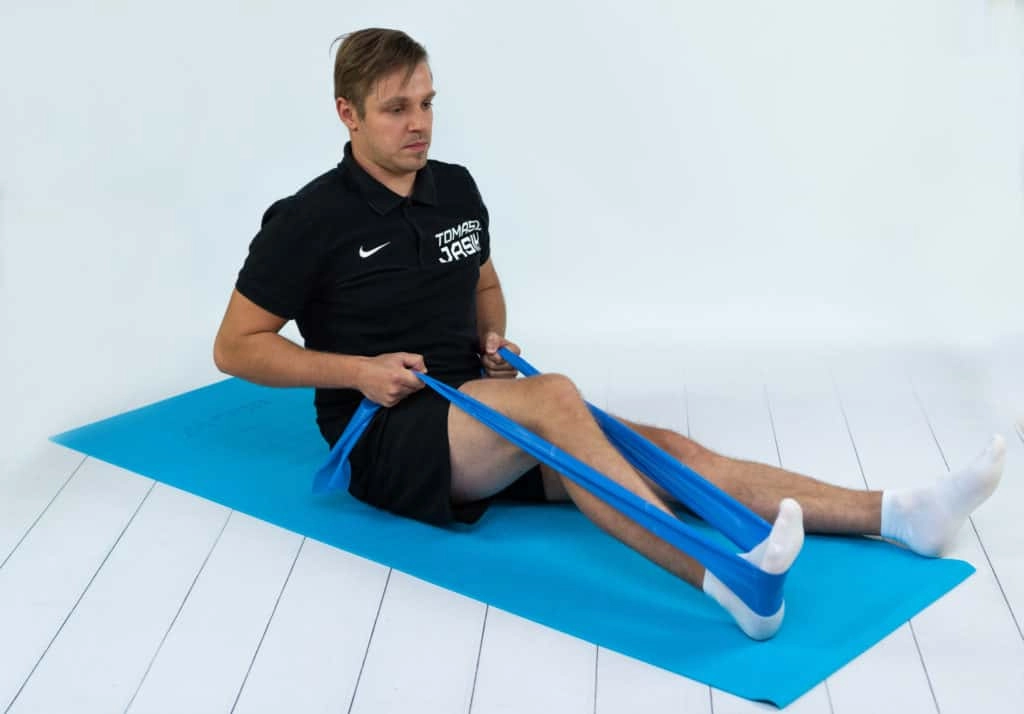 - Ruch: wykonaj aktywny wyprost w stawie kolanowym rozciągając stopą taśmę i utrzymaj 5 sekund,